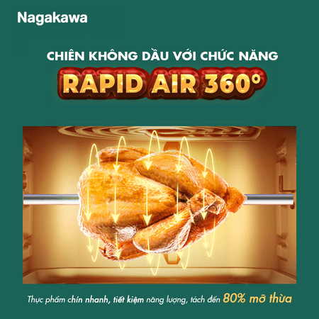 Bên cạnh đó, công nghệ Rapid Air làm chín thức ăn bằng luồng không khí lưu chuyển nhanh hơn gấp nhiều lần, tối ưu được lượng nhiệt, tránh thất thoát nhiệt ra ngoài . Nhiệt từ bộ phận làm nóng được truyền theo 2 hướng: hướng thứ nhất hướng lên mặt trên của thực phẩm và hướng thứ 2 là xuống đáy nồi và phản xạ ngược lại giúp thực phẩm chín đều, thơm ngọt bên trong, vàng giòn bên ngoài.