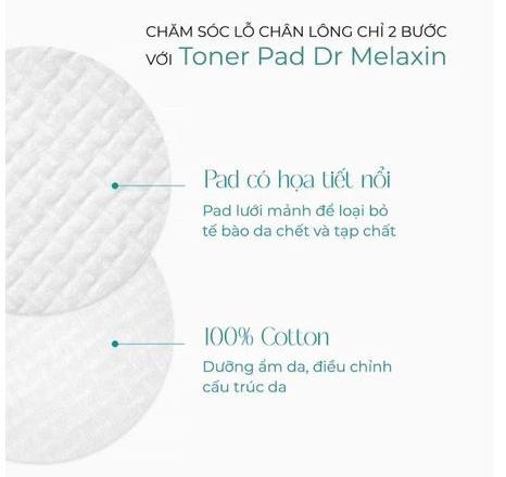 Sản phẩm được thiết kế với hai mặt đặc biệt: mặt họa tiết nổi giúp tẩy tế bào chết và làm sạch sâu lỗ chân lông, trong khi mặt trơn hỗ trợ dưỡng chất thẩm thấu tốt hơn, mang lại cảm giác dịu nhẹ và dễ chịu khi sử dụng. Toner Pad Dr Melaxin phù hợp với mọi loại da, đặc biệt là da dầu, da mụn hoặc da có lỗ chân lông to.