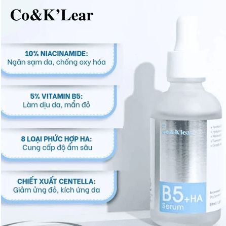 Serum Dưỡng Ẩm Phục Hồi Da B5+HA Co & K’lear là một sản phẩm chăm sóc da cao cấp đến từ thương hiệu Co & K’lear, có xuất xứ từ Hàn Quốc – quốc gia nổi tiếng với các sản phẩm làm đẹp chất lượng cao. Với dung tích 50ml, sản phẩm được thiết kế để cung cấp giải pháp toàn diện cho làn da, đặc biệt phù hợp với những người có làn da nhạy cảm, da mụn hoặc cần dưỡng ẩm sâu, làm sáng và chống lão hóa.
