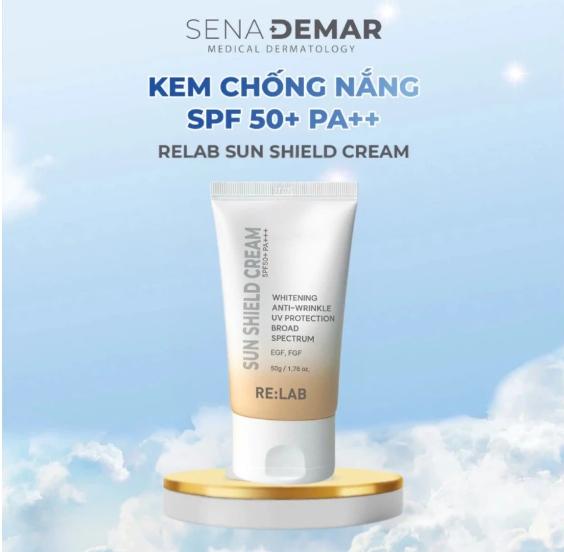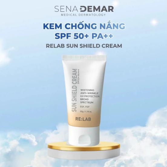 Kem Chống Nắng Phổ Rộng Re:Lab Sun Shield Cream là kem chống nắng cao cấp nhập khẩu từ Hàn Quốc, thuộc thương hiệu Re:Lab nổi tiếng với các sản phẩm dưỡng da công nghệ cao. Sản phẩm tích hợp khả năng bảo vệ da khỏi tia UVA/UVB nhờ bộ lọc vật lý và hóa học, đồng thời dưỡng trắng, trẻ hóa da với các thành phần như EGF, FGF, và 8 loại Peptide. Kết cấu kem mỏng nhẹ, thẩm thấu nhanh, không bết dính, nâng tone tự nhiên, mang lại làn da sáng mịn như vừa makeup. Dung tích 50ml dùng được 2-3 tháng, phù hợp cho cả da nhạy cảm, da dầu hay da khô.
