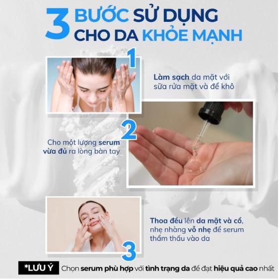 - Lấy 2-3 giọt serum, thoa đều khắp mặt, vỗ nhẹ để thẩm thấu.