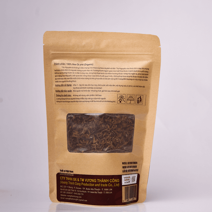 - 100% hoa cà phê từ vườn cà phê hữu cơ có giấy chứng nhận. Mang đến cho người thưởng thức hương vị đặc trưng của hoa cà phê, mà không có bất kỳ loại trà nào cũng có thể mang lại.