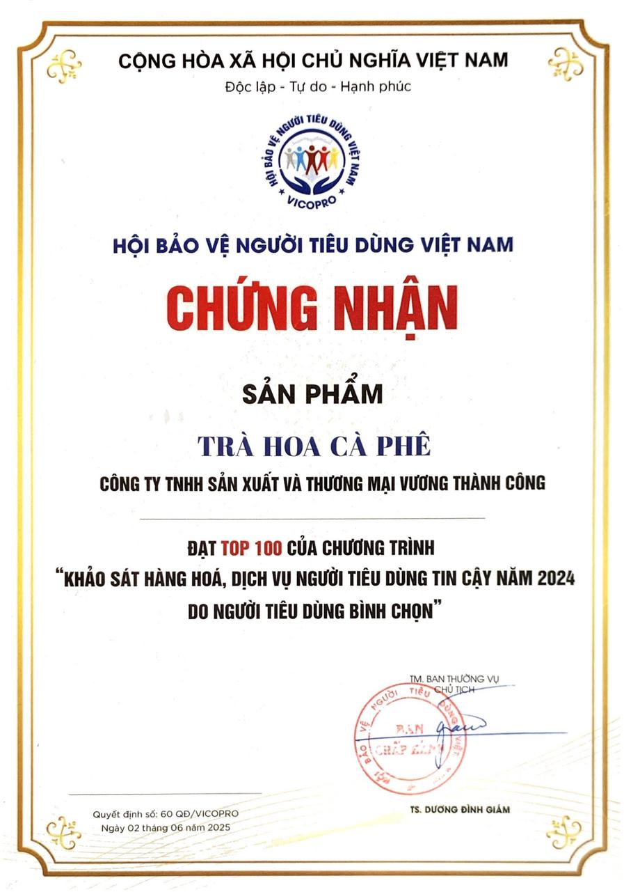 - Trà hoa cà phê là dòng sản phẩm được mệnh danh với tên gọi là tinh hoa cà phê. Đây là sản phẩm trà đầu tiên do công ty Vương Thành Công sản xuất, sản phẩm được cấp quyền tác giả và được rất nhiều khách hàng yêu thích, khen ngợi.