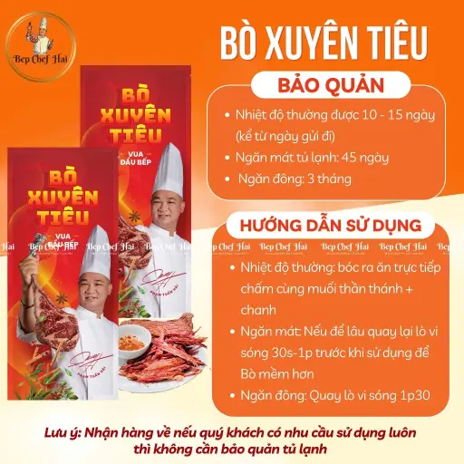 Bò Xuyên Tiêu Chef Hải là món thịt bò khô cao cấp, được chế biến từ 100% thịt bò mông tươi, mang đến hương vị đậm đà đặc trưng với công thức xuyên tiêu độc quyền, kết hợp thơm nồng từ tỏi phi, sả và gừng. Sản phẩm thuộc thương hiệu Bếp Chef Hải - Chuẩn vị "nhà hàng 5 sao" từ MasterChef Phạm Tuấn Hải, phù hợp làm món ăn vặt, mồi nhậu cùng bia rượu, hoặc quà biếu sang trọng. Với độ cay vừa phải, từng thớ thịt mềm dẻo, đỏ au và không chứa phẩm màu, đây là lựa chọn lý tưởng cho những ai yêu thích ẩm thực Việt Nam hiện đại.