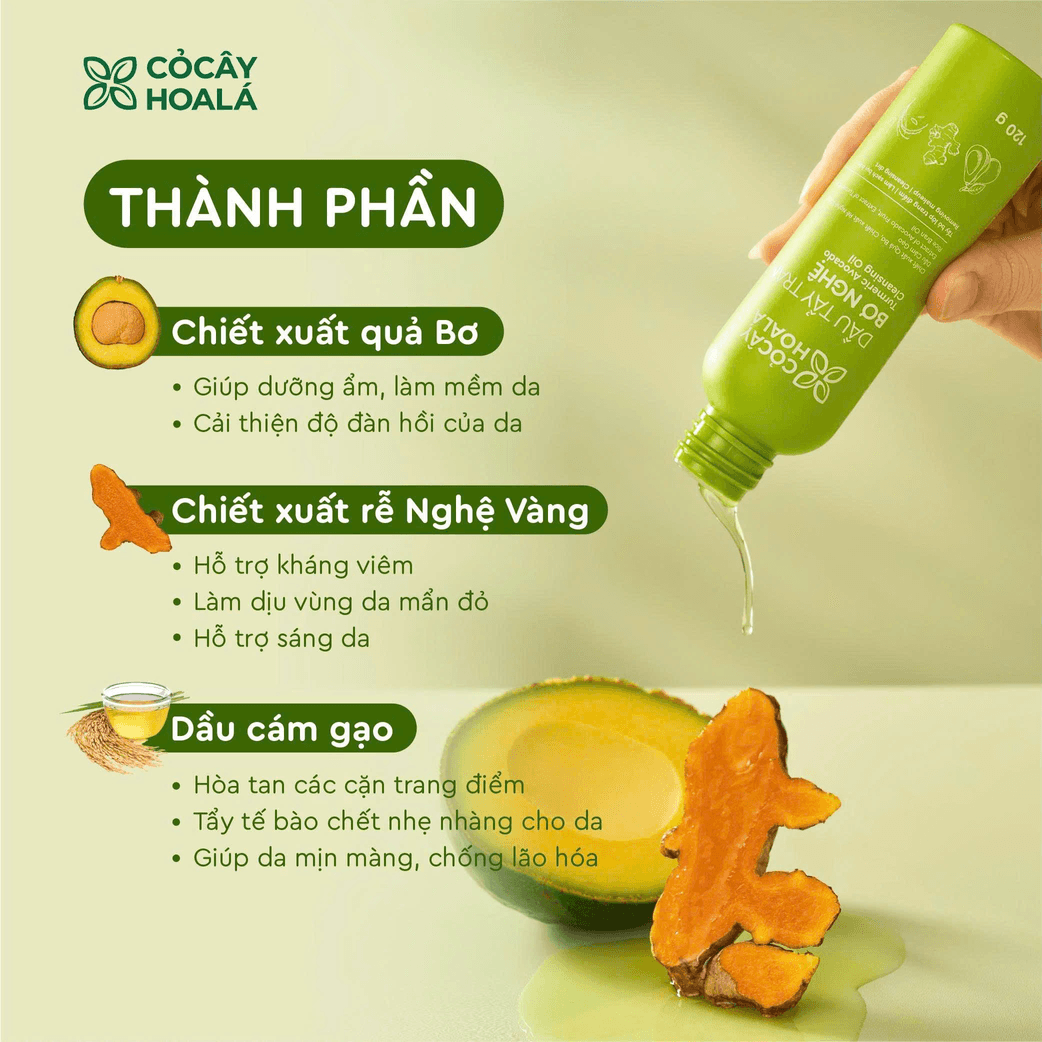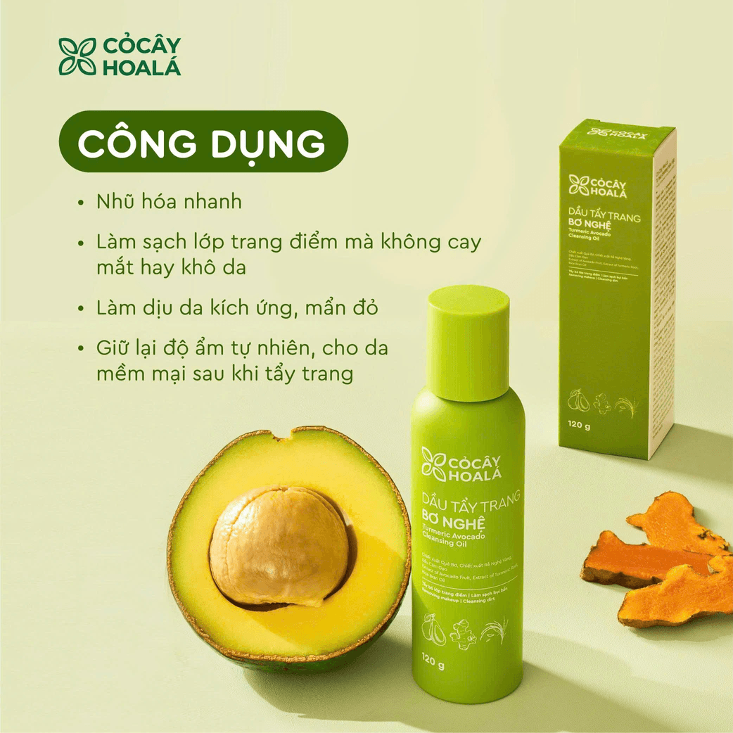 Dầu Tẩy Trang Bơ Nghệ Cỏ Cây Hoa Lá giúp: tẩy bỏ lớp trang điểm, làm sạch bụi bẩn trên da