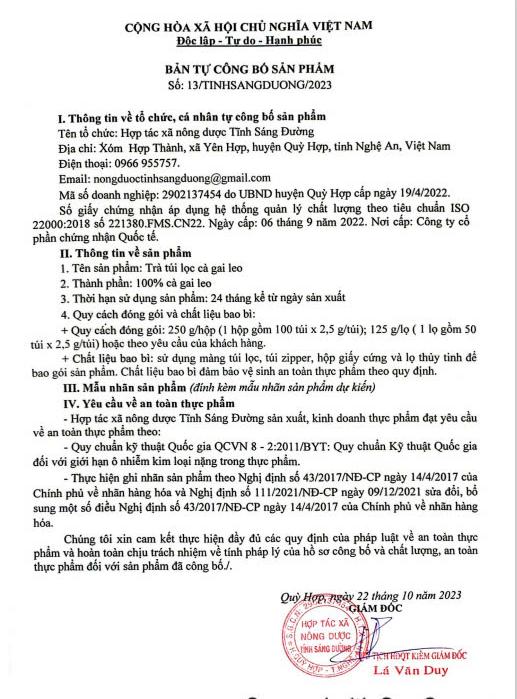 - Bản tự công bố sản phẩm: Số 13/TINHSANGDUONG/2023.