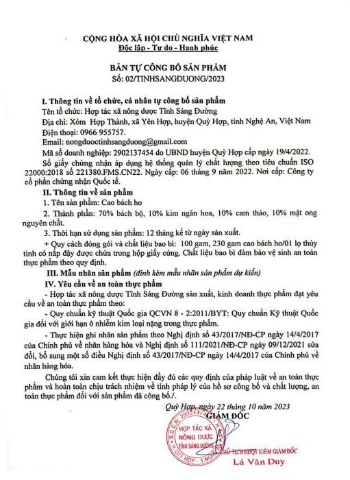 - Bản tự công bố sản phẩm: Số 02/TINHSANGDUONG/2023.