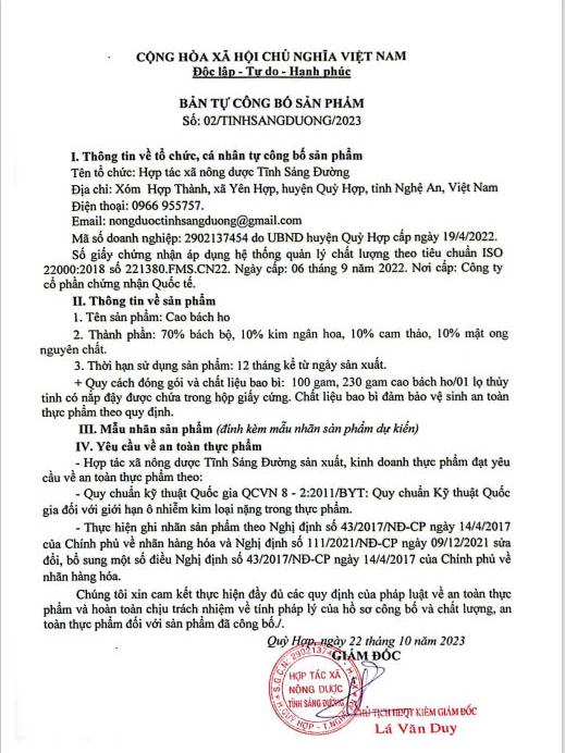 - Bản tự công bố sản phẩm: Số 02/TINHSANGDUONG/2023.