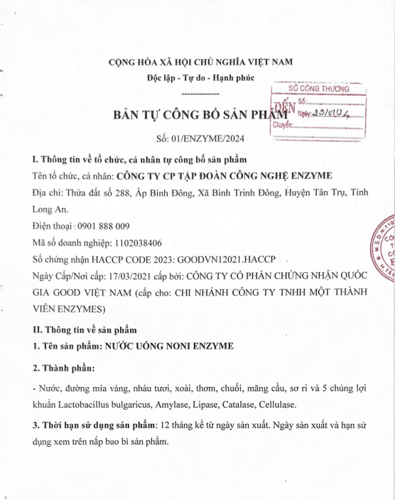 Noni Enzyme – Siêu thực phẩm sinh học thế hệ mới Được nghiên cứu & phát triển bởi Enzyme Group suốt 10 năm, Noni Enzyme là nước uống lên men từ 80% trái nhàu (noni) tươi hữu cơ nguyên chất kết hợp công nghệ S.B.O (Soha Biotic) độc quyền duy nhất tại Việt Nam – lên men 365 ngày ở 37°C với 5 loại enzyme quan trọng và hàng tỷ bào tử lợi khuẩn.