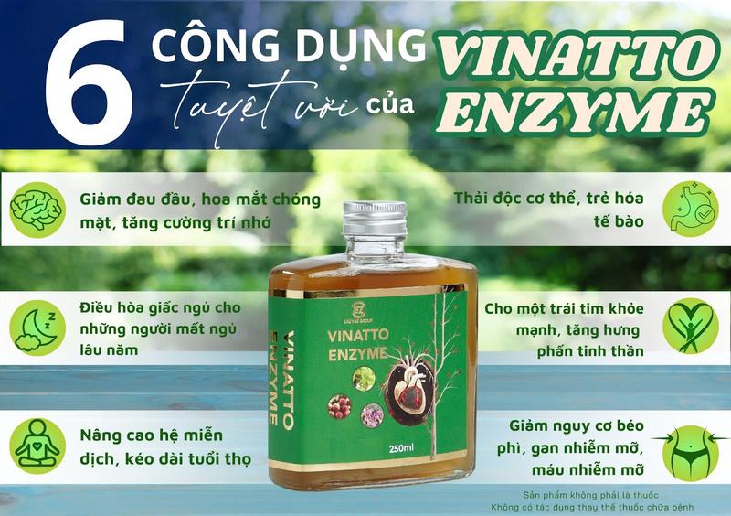 Vinatto Enzyme không phải là thuốc, và không có tác dụng thay thế thuốc chữa bệnh. Tuy nhiên, dòng sản phẩm này đã được chứng thực là có khả năng hỗ trợ điều trị bệnh và phòng ngừa các tác nhân xấu gây bệnh. Một số nhà nghiên cứu đã chỉ ra Vinatto Enzyme chứa nhiều hoạt chất và dưỡng chất hỗ trợ đánh tan cục huyết khối (máu đông), giảm nguy cơ hình thành huyết khối và tăng cường trao đổi chất.