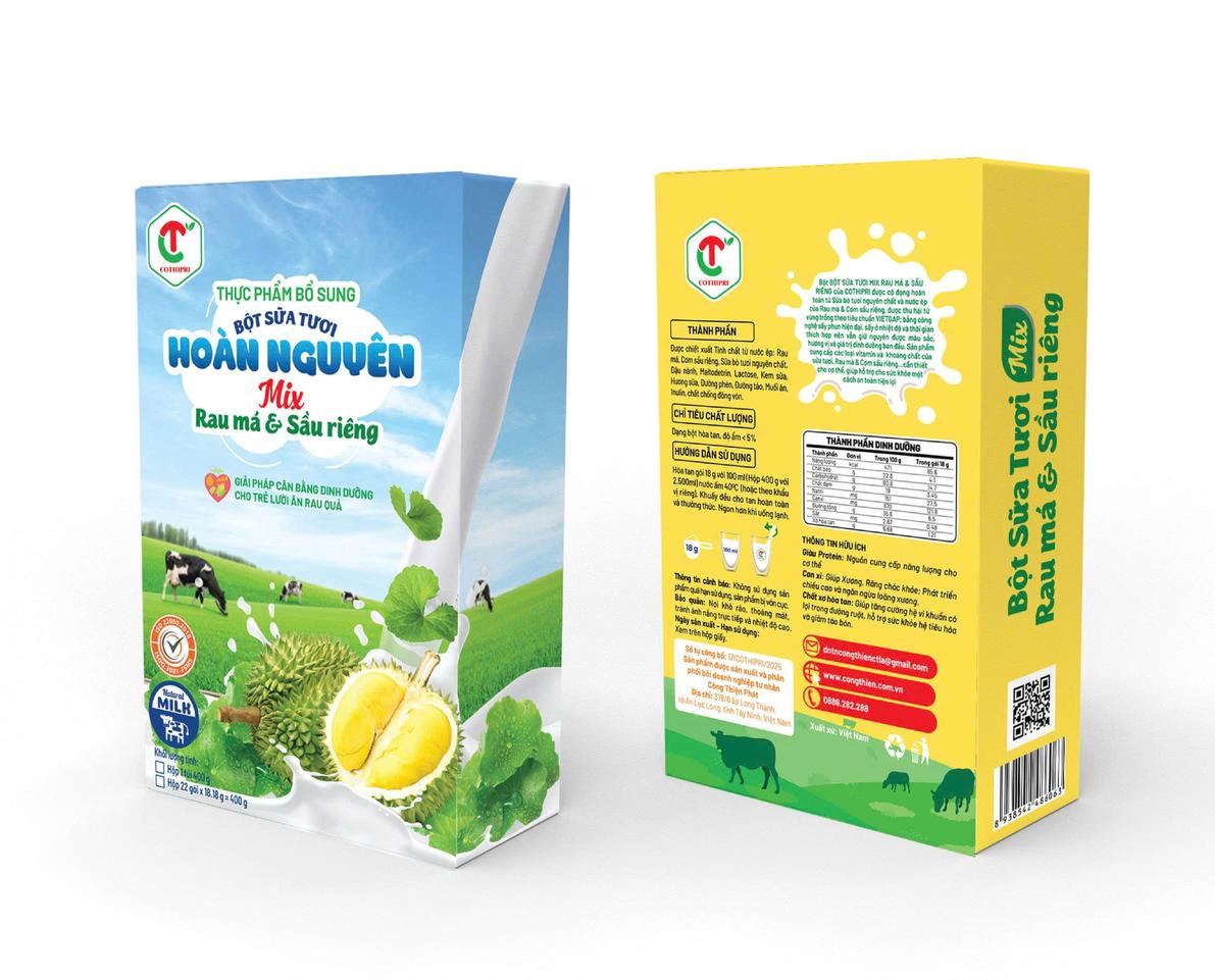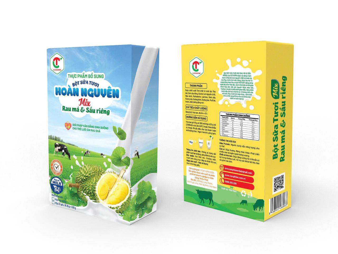 Bột Sữa Tươi Hoàn Nguyên Mix Rau Má & Sầu Riêng là sản phẩm thực phẩm bổ sung do Doanh nghiệp tư nhân Công Thiện Phát (thương hiệu COTHIPRI) sản xuất tại tỉnh Tây Ninh, Việt Nam, được cô đặc hoàn toàn từ sữa bò tươi nguyên chất kết hợp nước ép rau má và cơm sầu riêng thu hoạch từ vùng trồng đạt chuẩn VietGAP, sử dụng công nghệ sấy phun hiện đại giúp giữ nguyên màu sắc, hương vị tự nhiên và các dưỡng chất sẵn có của nguyên liệu, từ đó hỗ trợ bổ sung một phần protein, vitamin, khoáng chất cùng chất xơ hòa tan vào chế độ ăn hàng ngày một cách tiện lợi và an toàn.