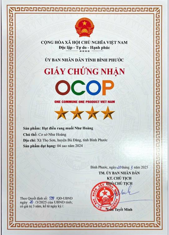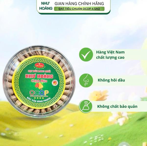 Hạt Điều Rang Muối Như Hoàng OCOP 4 Sao không chỉ là món ăn vặt, mà là sự chăm chút trong từng hạt điều, là hương vị mà bạn có thể tự tin gửi gắm đến những người yêu thương. Mỗi lần mở hộp là một lần cảm nhận sự giòn tan, thơm bùi và chân thật của nông sản Việt - giản dị nhưng đủ đầy, mộc mạc nhưng sang trọng.