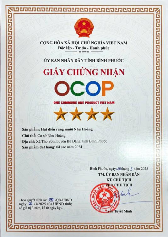 Hạt Điều Rang Muối Như Hoàng OCOP 4 Sao không chỉ là món ăn vặt, mà là sự chăm chút trong từng hạt điều, là hương vị mà bạn có thể tự tin gửi gắm đến những người yêu thương. Mỗi lần mở hộp là một lần cảm nhận sự giòn tan, thơm bùi và chân thật của nông sản Việt - giản dị nhưng đủ đầy, mộc mạc nhưng sang trọng.