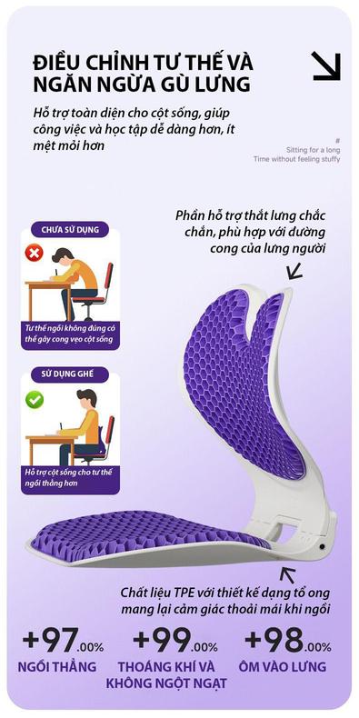- Đệm TPE tổ ong êm ái: Giảm áp lực vùng xương cụt với hai lỗ tròn thông minh, mang lại sự thoải mái khi ngồi lâu.