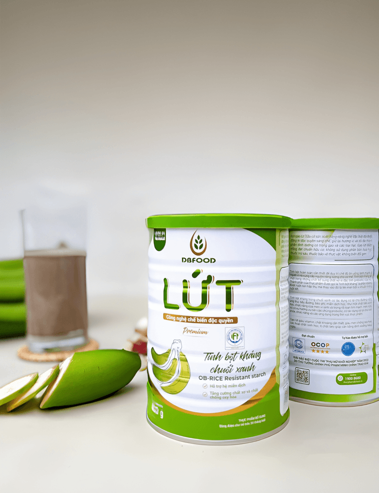 Bột gạo lứt hữu cơ LỨT tinh bột kháng chuối xanh được sản xuất tại Việt Nam từ nguyên liệu hữu cơ, kết hợp tinh bột kháng chuối xanh 22%, gạo lứt thảo cẩm & gạo lứt xanh cùng các hạt cao cấp macca, sachi, óc chó, hạnh nhân, hạt điều, giúp bổ sung chất xơ dồi dào, vitamin và khoáng chất tự nhiên, hỗ trợ cải thiện tiêu hóa, làm sạch đường ruột, ổn định đường huyết tự nhiên, đặc biệt phù hợp cho người có vấn đề về dạ dày, đại tràng và cần kiểm soát đường huyết.