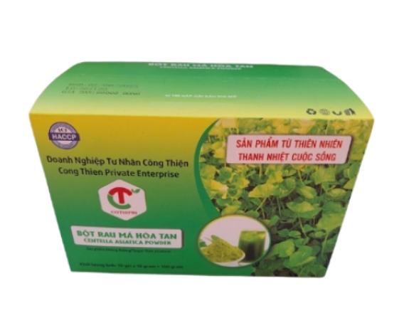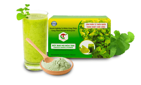 Bột rau má hòa tan được sản xuất bởi Doanh Nghiệp tư nhân Công Thiện Phát – Long An theo công nghệ sấy phun sương hiện đại, giữ nguyên 70% nước ép rau má tươi nguyên chất từ vùng trồng sạch, giúp bổ sung chất xơ và hoạt chất sinh học tự nhiên, hỗ trợ mát gan giải độc, giảm nhiệt miệng, làm sáng da, cấp ẩm, cải thiện sức khỏe kinh nguyệt và phục hồi cơ thể nhanh chóng chỉ trong vài giây hòa tan.