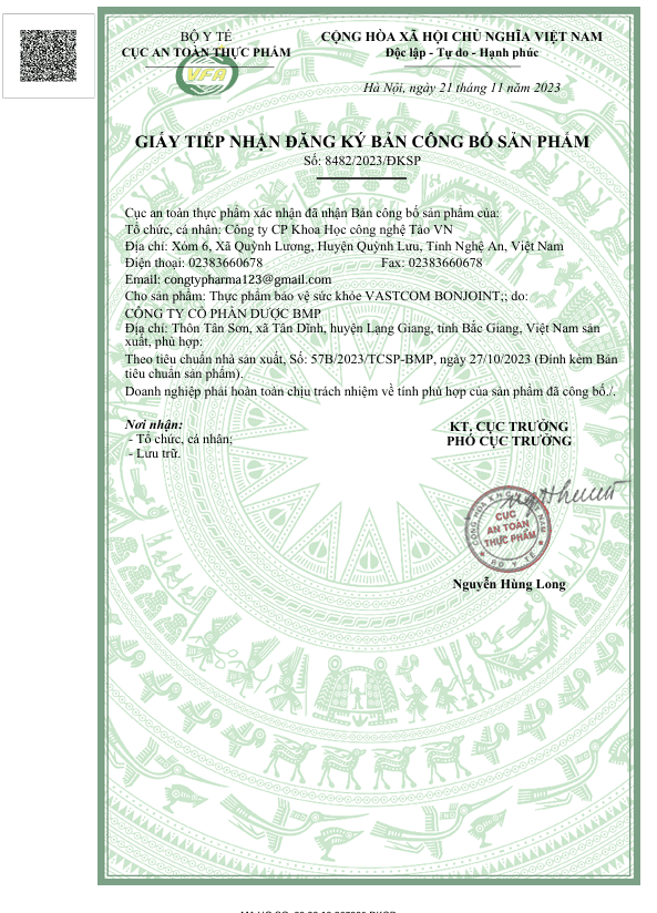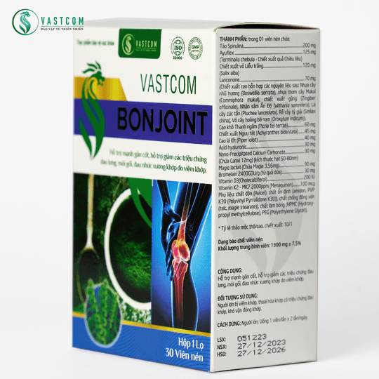 Sản phẩm VASTCOM Bonjoint là thực phẩm bảo vệ sức khỏe hỗ trợ xương khớp và bổ sung Canxi có nguồn gốc từ Tảo xoắn Spirulina, kết hợp cùng các chiết xuất dược liệu quý như Ayuflex, vỏ Liễu trắng, chiết xuất ngưu tất, Lanconone,… Sản phẩm được nghiên cứu để hỗ trợ giảm đau nhức, viêm khớp, thoái hóa khớp và làm trơn ổ khớp một cách an toàn, lành tính, phù hợp cho người cao tuổi, người vận động nhiều hoặc người có bệnh lý về khớp.
