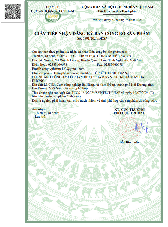 Sản phẩm TỐ NỮ THANH XUÂN VASTCOM là sản phẩm chăm sóc sức khỏe có nguồn gốc thiên nhiên, được chiết xuất từ các thành phần thảo dược cao cấp như Cao khô Củ sâm tố nữ, Bột tảo xoắn Spirulina, Bột chiết xuất củ Maca, Quả Trinh nữ châu Âu, Rễ Thiên môn chùm, cùng Kẽm gluconate, Curcuminoids, Vitamin E và Biotin (Vitamin H). Với thành phần đa dạng, TỐ NỮ THANH XUÂN hỗ trợ tăng cường nội tiết tố nữ, cải thiện sức khỏe làn da, giúp làm chậm quá trình lão hóa, bổ sung dưỡng chất cần thiết, tăng cường đề kháng và cân bằng nội tiết tố, phù hợp với phụ nữ mong muốn duy trì thanh xuân và sức khỏe toàn diện.