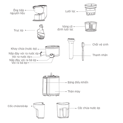 Khoang chứa nước épKhoang chứa nước ép từ nhựa nguyên sinh an toàn, dung tích 665ml thoải mái cho nhu cầu sử dụng gia đình 5 – 8 người.Lưới lọcMáy được trang bị 2 lưới lọc phục vụ 2 mục đích độc lập: làm nước ép và làm kem, bạn có thể thay đổi linh hoạt phù hợp với mục đích sử dụng.Trục épTrục ép xoắn, chất liệu PC 2 lớp dễ vệ sinh, ép hiệu quả với những nguyên liệu cứng và khô. Khoảng cách giữa trục vít và lưới lọc thu hẹp để ép triệt nguyên liệu.Ống épĐường kính ống tiếp nguyên liệu lớn lên đến 78mm cho phép bạn ép nguyên quả thuận tiện.Cốc chứa nước ép, bã épMáy được trang bị thêm 2 cốc chứa: một cốc chứa bã, một cốc chứa nước ép, tiện lợi cho người dùng trong quá trình sử dụng.