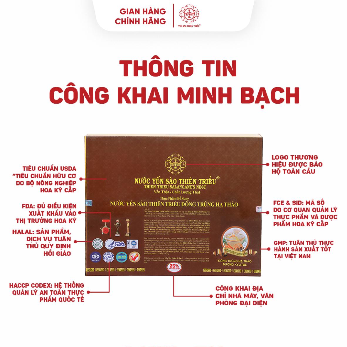 Thiên Triều là thương hiệu tiên phong công khai bảng giá trị dinh dưỡng rõ ràng trên từng hũ yến, tạo sự an tâm tuyệt đối cho người dùng.
