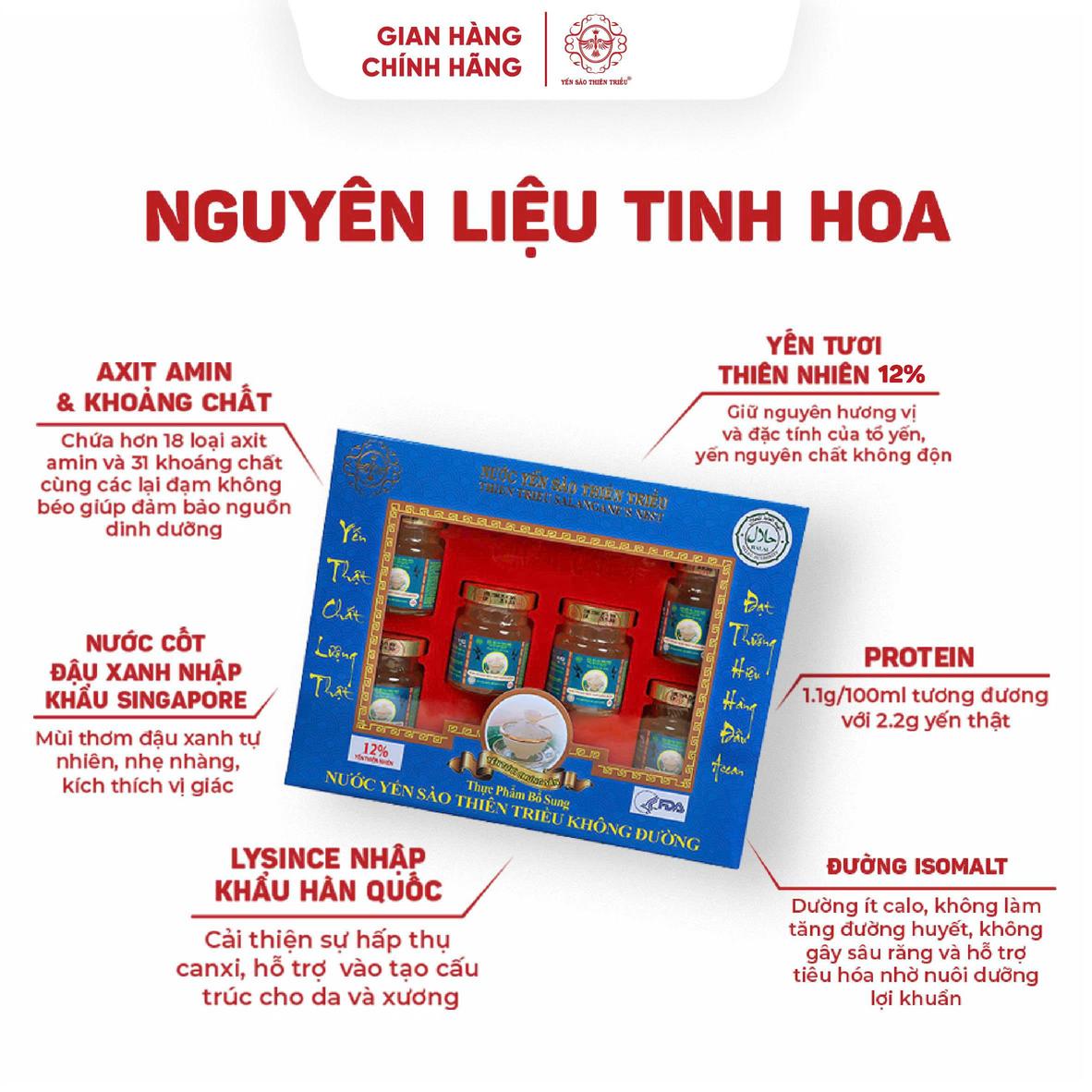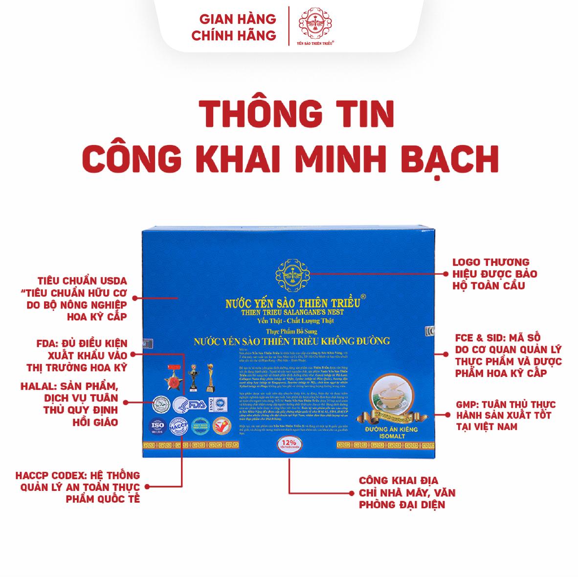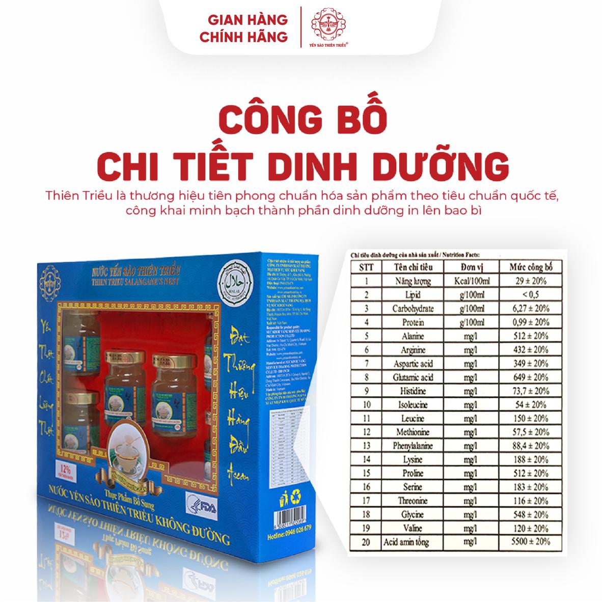 👉 Yến Sào Thiên Triều là thương hiệu tiên phong công khai bảng giá trị dinh dưỡng chi tiết trên từng hũ yến, giúp người tiêu dùng dễ dàng kiểm chứng chất lượng.