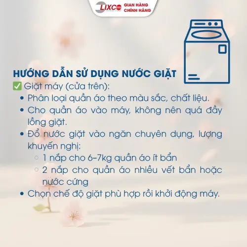 - Giặt máy: Dùng 60ml nước giặt cho một lần giặt thông thường (khoảng 15-20 chiếc quần áo). Chọn chế độ thích hợp của máy giặt và giặt theo hướng dẫn của nhà sản xuất máy.