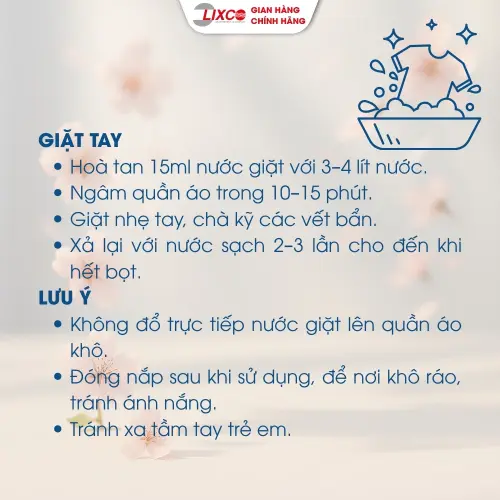 - Giặt tay: Xả sơ quần áo với nước sạch. Hòa tan 30ml nước giặt vào 3-5 lít nước để giặt khoảng 8-10 chiếc quần áo. Ngâm quần áo trong khoảng 15 phút để đạt hiệu quả tốt nhất. Vò nhẹ và xả từ 2-3 lần với nước sạch. Vắt và phơi khô quần áo.