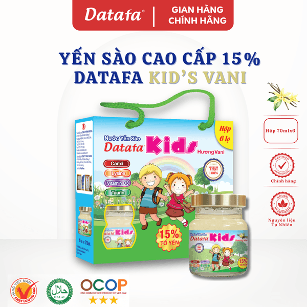 Yến Sào Trẻ Em DATAFA KID'S 15% Tổ Yến - Tăng Chiều Cao, Chắc Xương, Sáng Mắt. Bạn đang tìm kiếm thực phẩm bồi bổ sức khỏe cho trẻ từ 12 tháng tuổi? Yến sào Datafa Kid's (Lọ 70ml) cung cấp nguồn đạm cao, ít béo và các vitamin khoáng chất thiết yếu như D3, Vitamin giúp bé phát triển trí não và hệ miễn dịch toàn diện. Sản phẩm cam kết 100% yến thật, không chất bảo quản, đạt chứng nhận Hàng Việt Nam Chất Lượng Cao - An toàn tuyệt đối cho hệ tiêu hóa non nớt của trẻ.