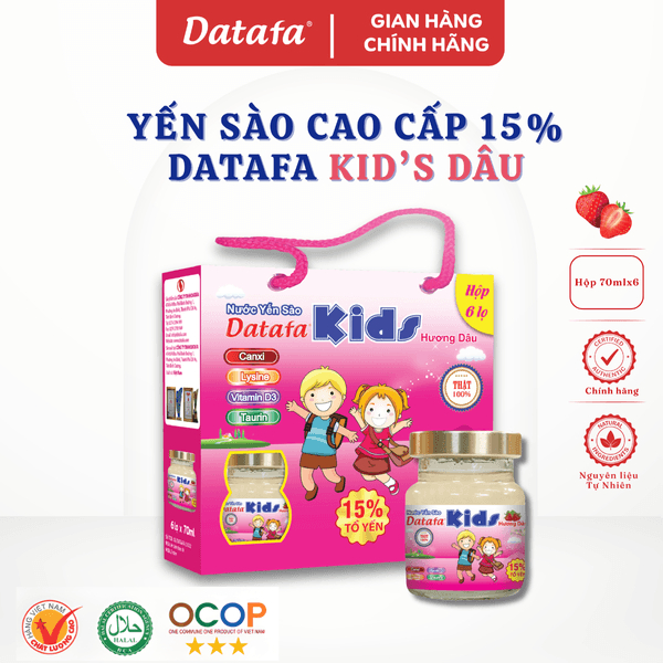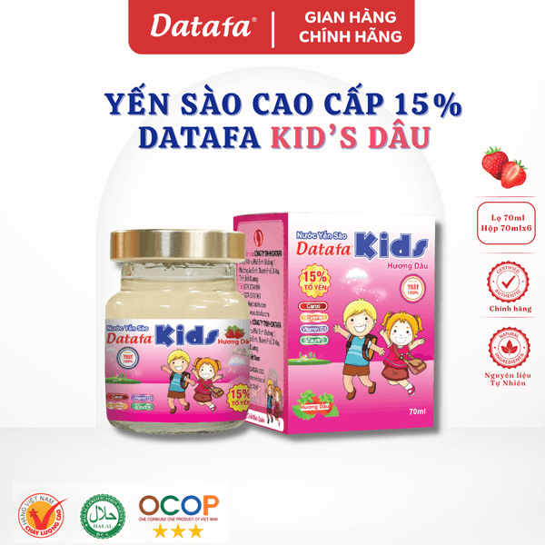 Yến Sào Trẻ Em DATAFA KID'S 15% Tổ Yến - Tăng Chiều Cao, Chắc Xương, Sáng Mắt. Bạn đang tìm kiếm thực phẩm bồi bổ sức khỏe cho trẻ từ 12 tháng tuổi? Yến sào Datafa Kid's (Lọ 70ml) cung cấp nguồn đạm cao, ít béo và các vitamin khoáng chất thiết yếu như D3, Vitamin giúp bé phát triển trí não và hệ miễn dịch toàn diện. Sản phẩm cam kết 100% yến thật, không chất bảo quản, đạt chứng nhận Hàng Việt Nam Chất Lượng Cao - An toàn tuyệt đối cho hệ tiêu hóa non nớt của trẻ.
