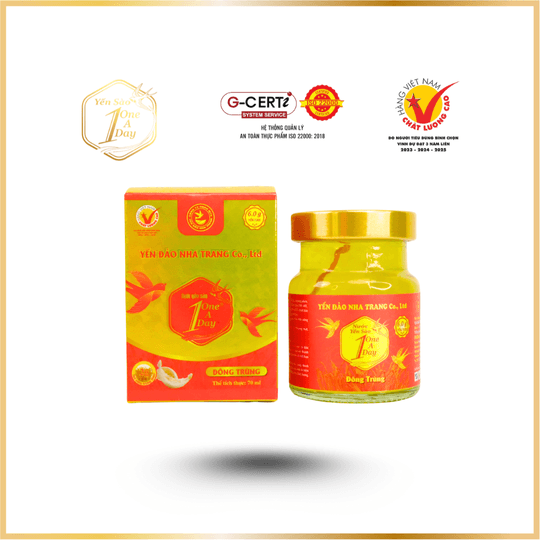 Nước Yến One A Day Đông Trùng Hạ Thảo 6.0g là sản phẩm dinh dưỡng cao cấp, kết hợp yến sào nguyên chất 100% và đông trùng hạ thảo tự nhiên, giúp bồi bổ cơ thể, tăng cường sức đề kháng và hỗ trợ chức năng các cơ quan quan trọng. Sản phẩm tiện lợi dạng lọ đơn 70ml, phù hợp sử dụng mỗi ngày cho người bận rộn.