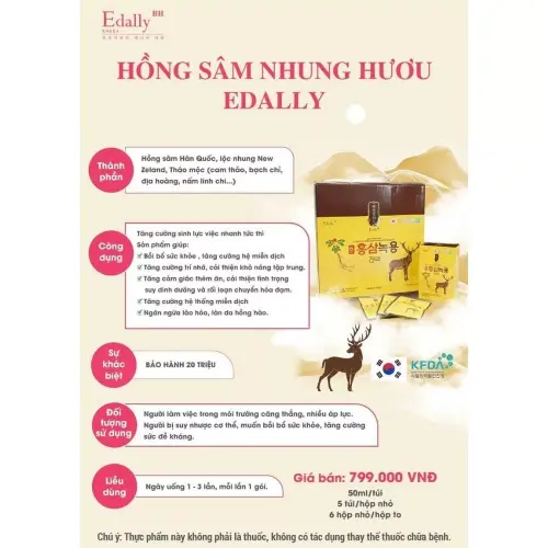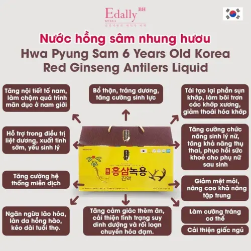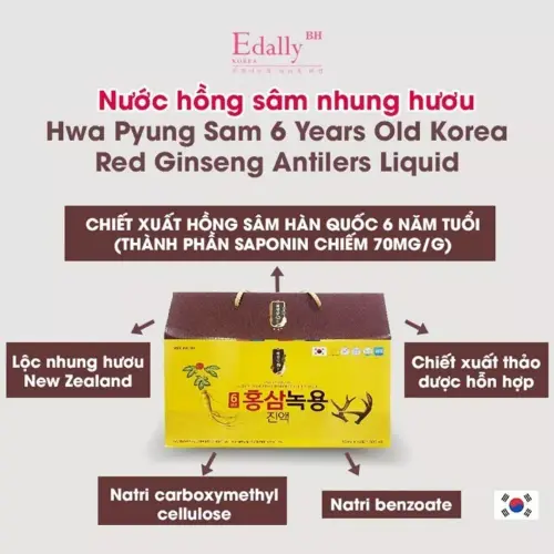 Nước Hồng Sâm Nhung Hươu Edally BH là sự kết hợp tinh túy giữa các loại dược liệu quý hiếm bậc nhất từ thiên nhiên như Hồng sâm Hàn Quốc và Lộc nhung New Zealand. Sản phẩm được thiết kế dưới dạng gói nước tiện lợi, là giải pháp hoàn hảo để bồi bổ sức khỏe toàn diện, tăng cường sinh lực và giải tỏa mệt mỏi cho người bận rộn trong cuộc sống hiện đại.