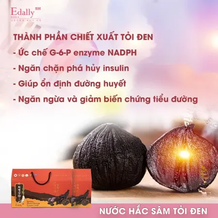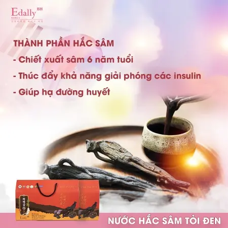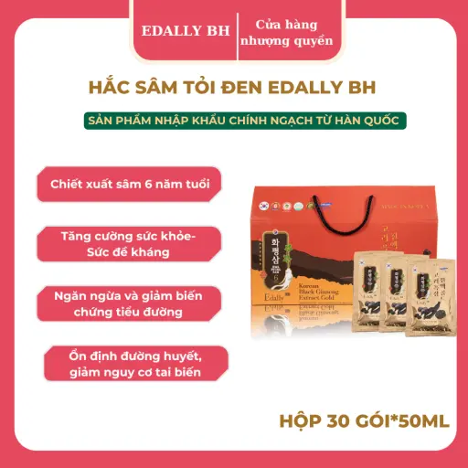 Nước Hắc Sâm Tỏi Đen Edally BH là sản phẩm cao cấp nhập khẩu chính ngạch từ Hàn Quốc, được chiết xuất từ hắc sâm 6 năm tuổi kết hợp với tỏi đen và linh chi. Đây là thực phẩm chức năng hỗ trợ tăng cường sức khỏe toàn diện, đặc biệt giúp ổn định đường huyết, hỗ trợ cải thiện lưu thông máu và hỗ trợ tăng cường đề kháng.