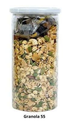 Granola 55 được thiết kế với tỷ lệ vàng bao gồm 55% các loại hạt, quả và 45% yến mạch. Danh mục thành phần chi tiết bao gồm: