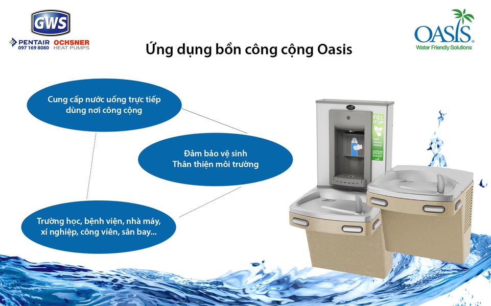 Bồn nước công cộng Oasis cung cấp nguồn nước đảm bảo vệ sinh, được dùng ở những nơi công cộng như: Trường học, bệnh viện, văn phòng, phòng gyms, sân bay, trung tâm thương mại và nhà hàng, …