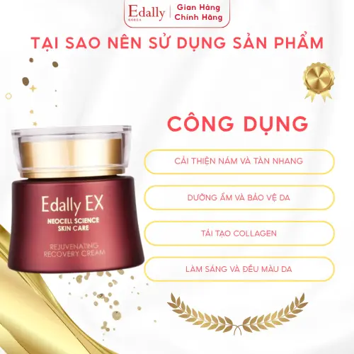 Kem Dưỡng Edally EX Rejuvenating Recovery Cream 50ml là sản phẩm cao cấp từ Hàn Quốc, được sản xuất bởi Tập đoàn Coreana Cosmetics, với công nghệ NEOCELL SCIENCE SKIN CARE độc quyền để phục hồi da sâu từ bên trong. Kem tập trung vào cải thiện nám, tàn nhang, dưỡng ẩm và chống lão hóa, giúp da mịn màng, săn chắc mà không gây kích ứng.