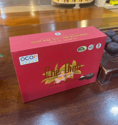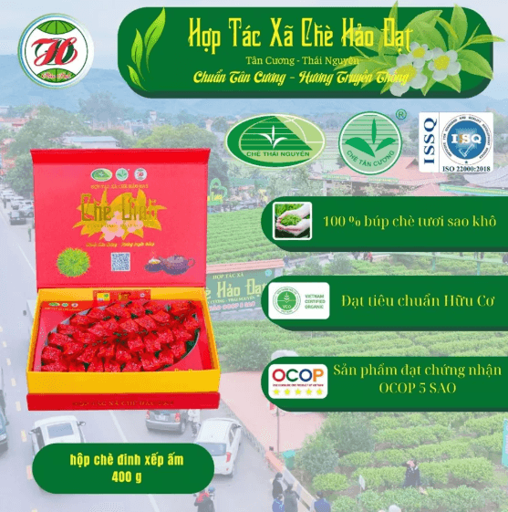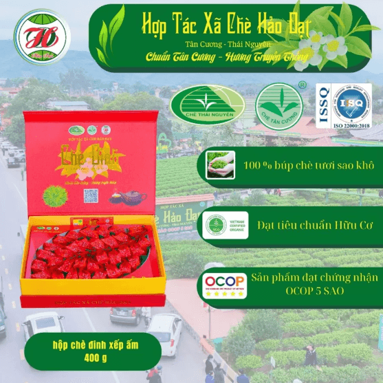 Hộp Kim Tuyến Chè Đinh 400g của HTX Chè Hảo Đạt là dòng trà thượng hạng được tuyển chọn từ những búp chè non tinh túy nhất vùng Tân Cương Thái Nguyên. Sản phẩm đạt chứng nhận OCOP 5 Sao Quốc Gia, đại diện cho chất lượng cao cấp của trà Việt với nguồn gốc xuất xứ rõ ràng và quy trình sản xuất đạt tiêu chuẩn vệ sinh an toàn thực phẩm nghiêm ngặt.