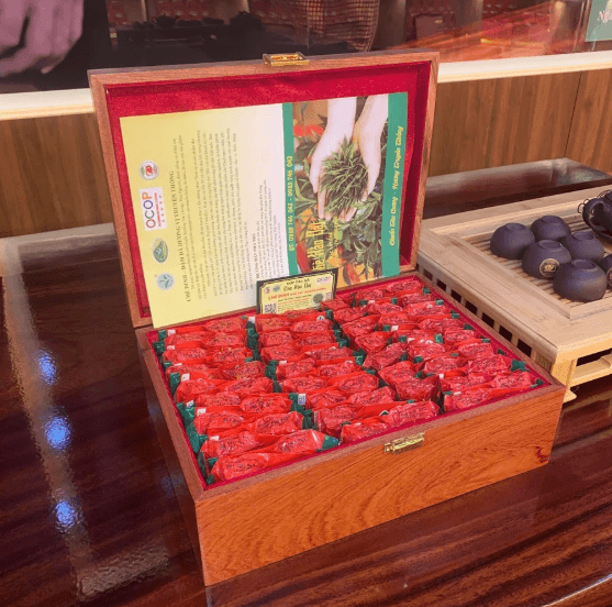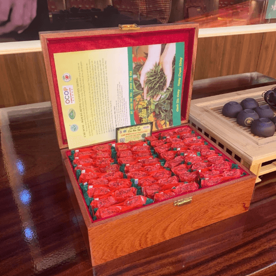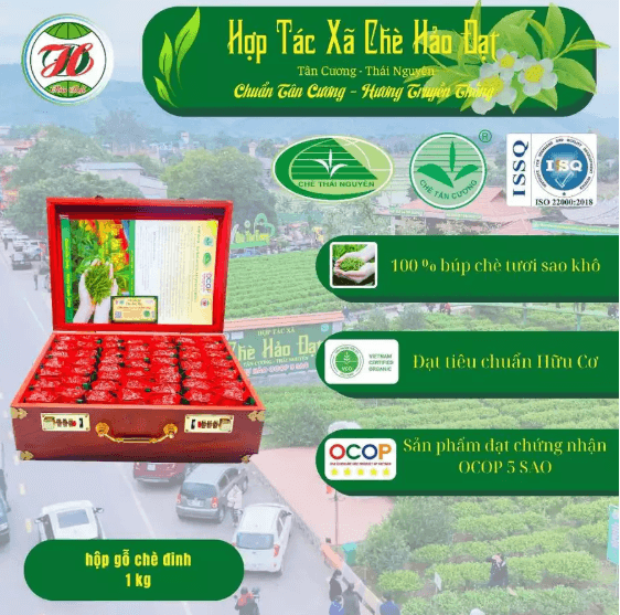 Bộ hộp gỗ chè Đinh sang trọng của HTX Chè Hảo Đạt là dòng trà thượng hạng tiêu biểu của vùng chè Tân Cương Thái Nguyên, được tuyển chọn kỹ lưỡng từ những búp chè non tinh túy nhất. Sản phẩm đạt chứng nhận OCOP 5 Sao Quốc Gia, khẳng định chất lượng cao cấp, nguồn gốc rõ ràng và quy trình sản xuất đáp ứng đầy đủ tiêu chuẩn vệ sinh an toàn thực phẩm.