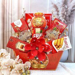V26146D gây ấn tượng mạnh mẽ với hình tượng hoa mẫu đơn đỏ rực rỡ làm trung tâm, kết hợp cùng các phụ kiện lá rẻ quạt vàng kim tinh xảo. Giỏ quà được bày trí theo cấu trúc phân tầng bề thế, biểu trưng cho sự thăng tiến và vững chãi. Điểm nhấn đặc biệt chính là biểu tượng “Xuân An Nhiên” được chạm khắc tỉ mỉ trên thân giỏ, biến món quà thành một tác phẩm nghệ thuật trưng bày đẳng cấp trong ngày Tết.