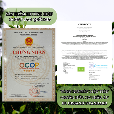 Sản phẩm đạt chứng nhận OCOP 5 Sao cùng vùng nguyên liệu đạt chuẩn Hữu cơ EU là lựa chọn lý tưởng cho người yêu trà sạch trà nguyên bản và lối sống lành mạnh.