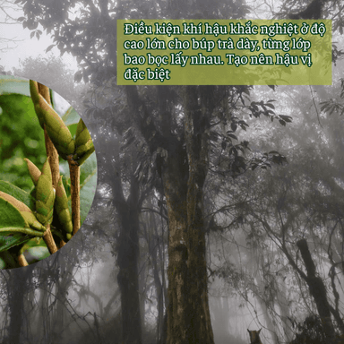 Trà được hái từ cây trà rừng hoang dã cao từ năm đến hai mươi mét, sinh trưởng hoàn toàn tự nhiên giữa tầng rừng già. Mỗi năm cây trà chỉ cho búp một vụ duy nhất vào tháng mười hai, tạo nên độ hiếm đặc trưng.