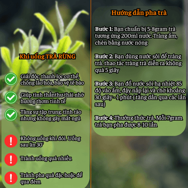Trà phù hợp để thưởng thức chậm, nhâm nhi và cảm nhận sự tinh khiết của trà rừng cổ thụ. Đặc biệt thích hợp cho những người yêu trà nguyên bản và thích sưu tầm dòng trà hiếm.