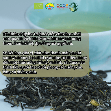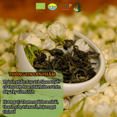 Hoa nhài được canh tác theo hướng hữu cơ tại Tây Côn Lĩnh, hái vào chiều muộn khi nụ đứng hương, tuyển chọn kỹ không dập nát và không đổi màu. Trà được ướp cùng hoa nhài trong khoảng mười giờ, sau đó hạ ẩm để hương bền, sạch và không gắt.