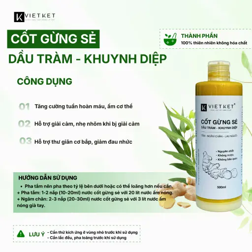 Cốt Gừng Sẻ - Dầu Tràm, Khuynh Diệp VIETKET 500ml là lựa chọn thảo dược tự nhiên giúp làm ấm cơ thể - thư giãn gân cốt - khử mùi kháng khuẩn, cực kỳ phù hợp để ngâm chân, tắm hoặc lau người tại nhà.