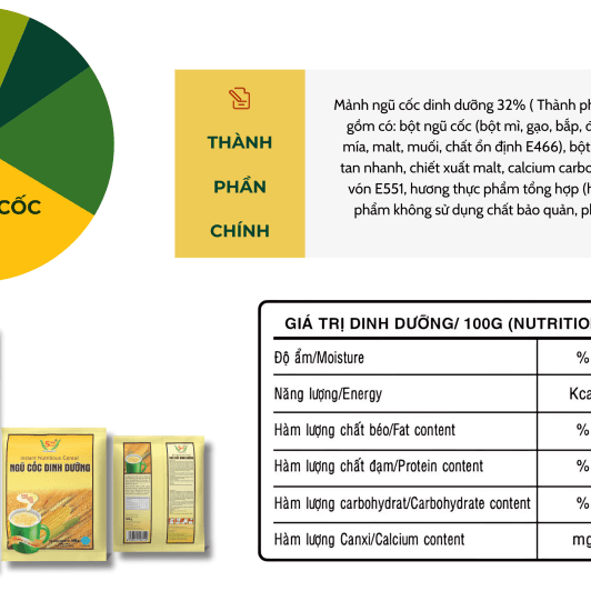 Thành phần: Mảnh ngũ cốc 32% (bột mì, gạo, bắp, đậu nành, mạch nha, đường mía, malt, muối), bột kem không sữa, sữa bột béo tan nhanh, chiết xuất malt, Canxi, hương vani và sữa tổng hợp.