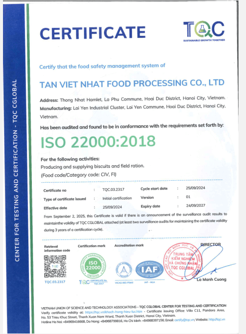 Tiêu chuẩn chất lượng: Đạt chuẩn quốc tế ISO 22000:2018.
