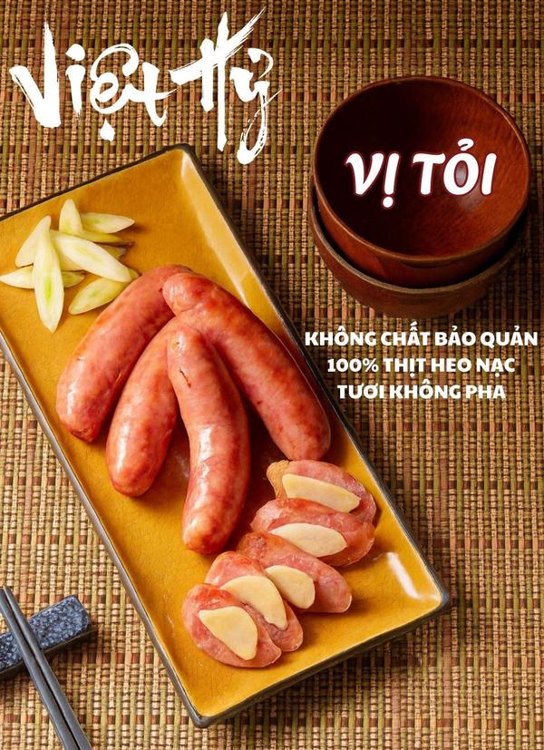 Lạp xưởng vị tỏi Việt Hỷ có vị ngọt béo thanh nhẹ, mùi thơm rõ ràng khi chín, phù hợp với nhiều cách dùng khác nhau như ăn cùng cơm trắng, xôi, bánh mì hoặc làm món ăn kèm trong bữa cơm hằng ngày. Đây là dòng hương vị phổ biến, dễ sử dụng, phù hợp với nhiều đối tượng người tiêu dùng.