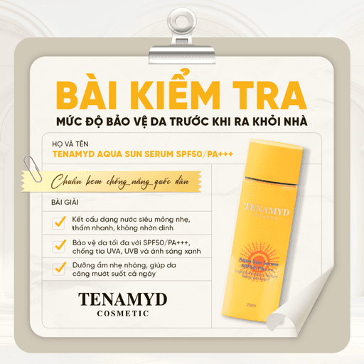 Tenamyd Aqua Sun Serum SPF50/PA+++ là tinh chất chống nắng thế hệ mới dạng serum nước, kết cấu siêu mỏng – siêu nhẹ – thẩm thấu nhanh, mang lại cảm giác khô thoáng, không nhờn rít khi sử dụng. Với chỉ số chống nắng cao SPF50/PA+++ cùng công thức bảo vệ 5X, sản phẩm giúp bảo vệ da toàn diện trước tia UVA/UVB, đồng thời cấp ẩm, tăng độ đàn hồi và nuôi dưỡng làn da sáng khỏe tự nhiên. Đặc biệt, lớp bột phấn mịn tạo hiệu ứng nâng tông nhẹ, đều màu da, thích hợp làm lớp lót trang điểm hằng ngày.