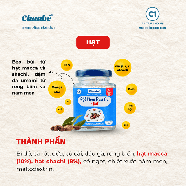 Bột nêm rau củ vị hạt Chan Bé kết hợp rau củ thiên nhiên cùng hạt macca (10%) và hạt sachi (8%), mang đến hương vị thơm béo đặc trưng, giúp món ăn dặm của bé thêm hấp dẫn. Đựng trong hũ thủy tinh đậy kín bảo vệ sản phẩm.