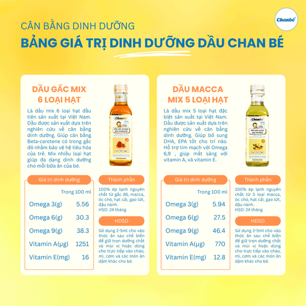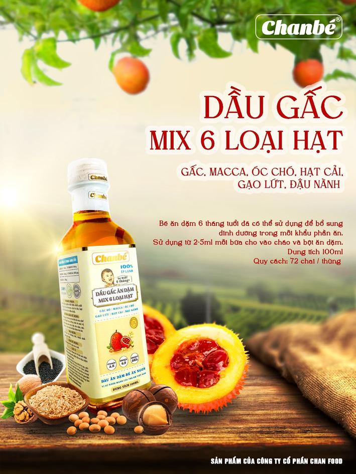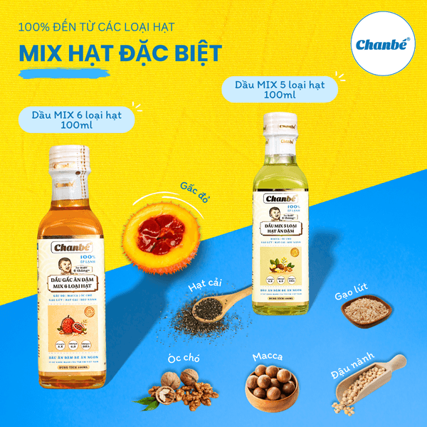 Dầu ăn dặm Mix 6 Loại Hạt Chan Bé là phiên bản cao cấp nhất trong bộ sưu tập dầu ăn dặm, được ép lạnh 100% từ gấc đỏ, macca, hạt óc chó, gạo lứt, hạt cải và đậu nành. Đặc biệt bổ sung gấc đỏ giàu beta-carotene giúp sáng mắt và tăng đề kháng cho bé.