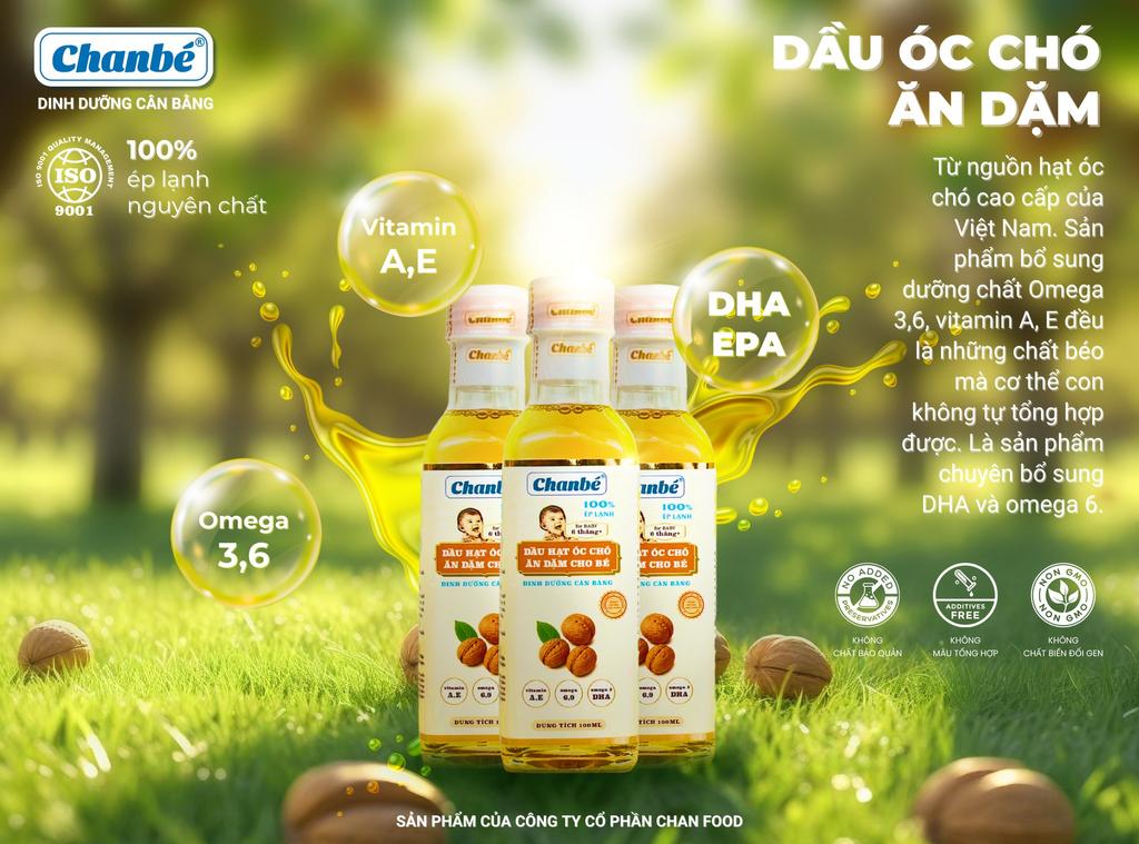 Dầu ăn dặm Hạt Óc Chó Chan Bé là dầu nguyên chất 100% ép lạnh từ hạt óc chó, bổ sung DHA tự nhiên giúp phát triển trí não và hệ thần kinh của bé ngay từ giai đoạn ăn dặm.